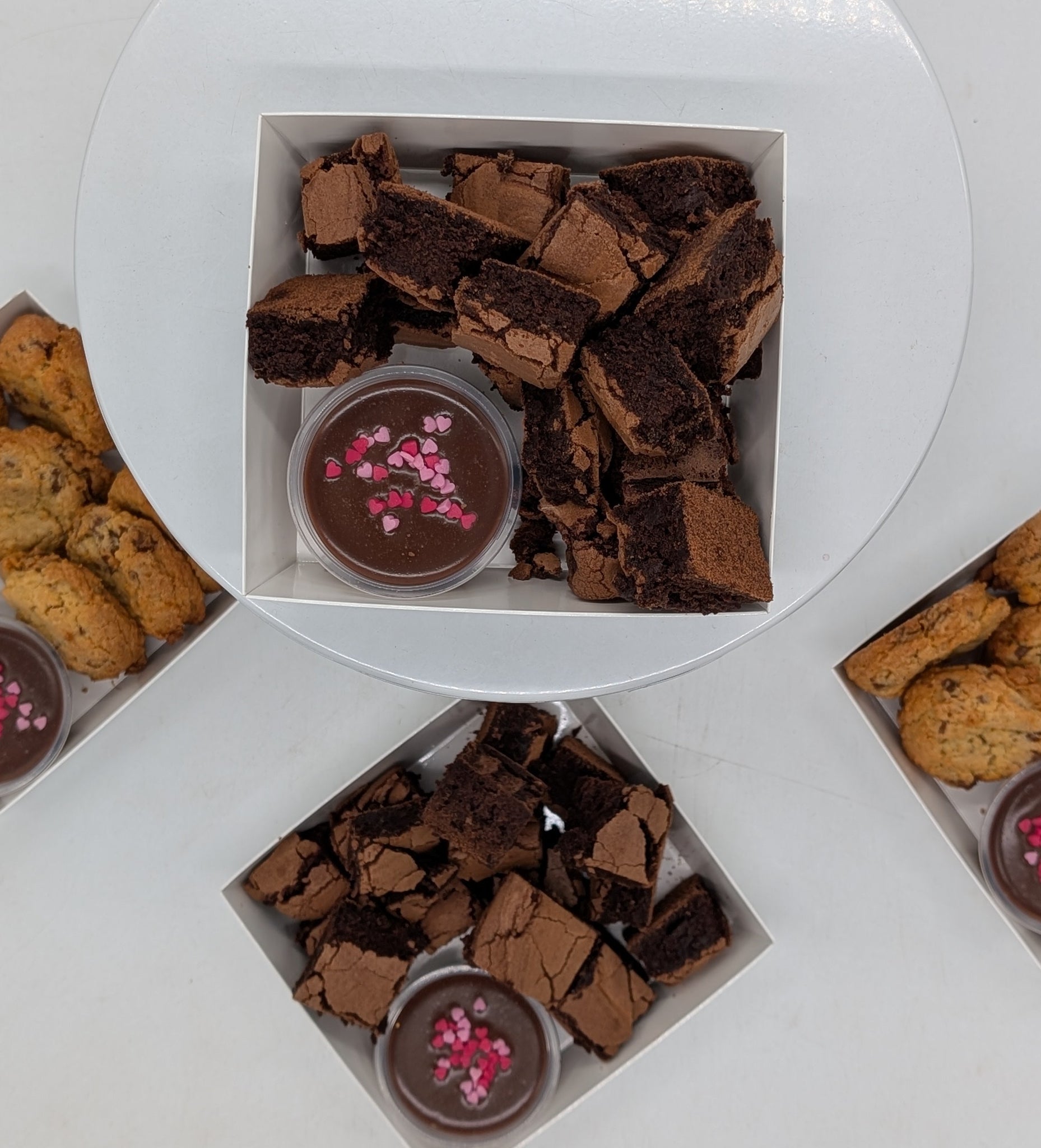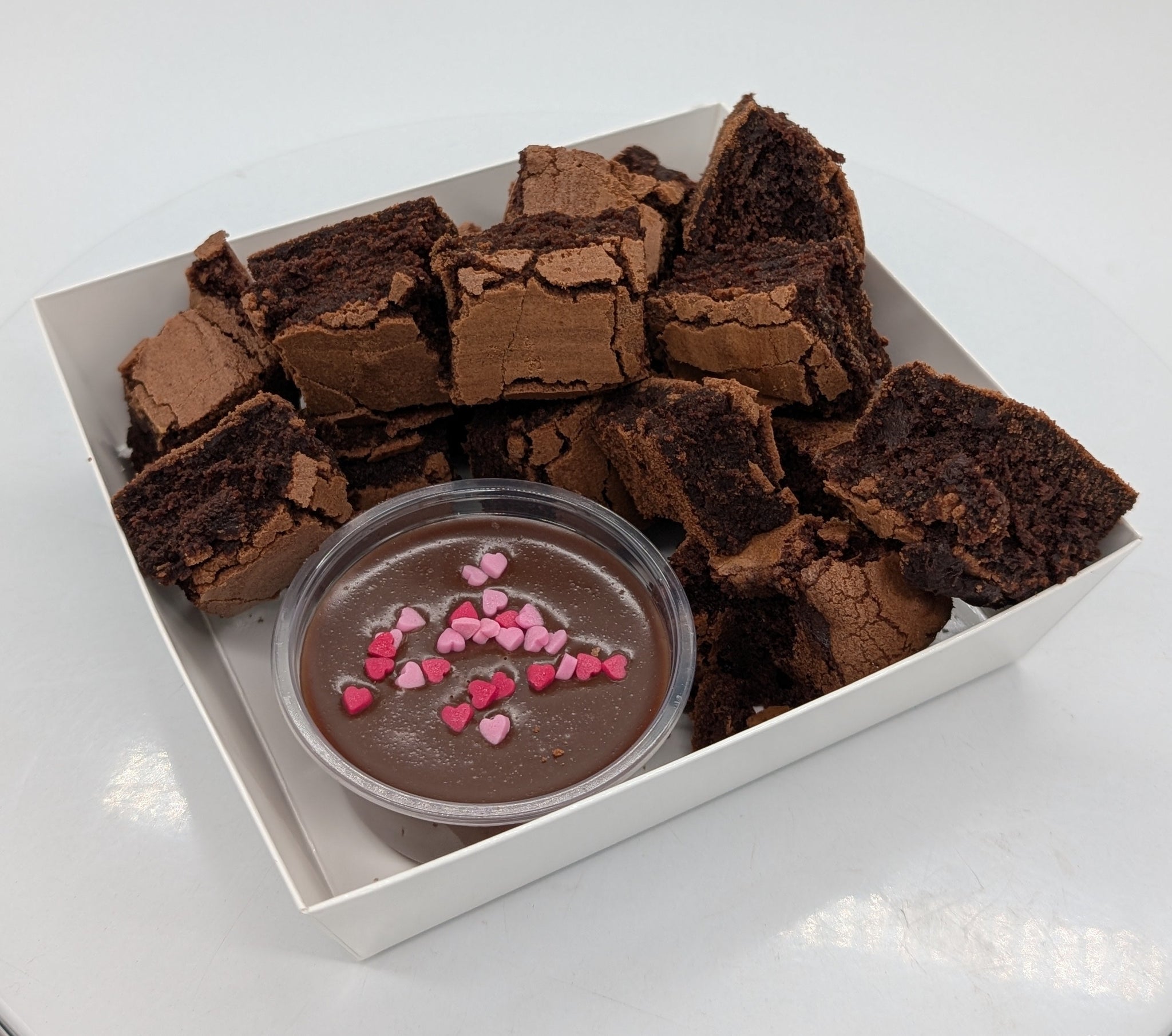 A beautiful little box of luxurious fudgy brownie bites complete with a ganache dipping pot with a cute heart garnish- perfect for chocolate lovers. Finished with a hand-tied red ribbon