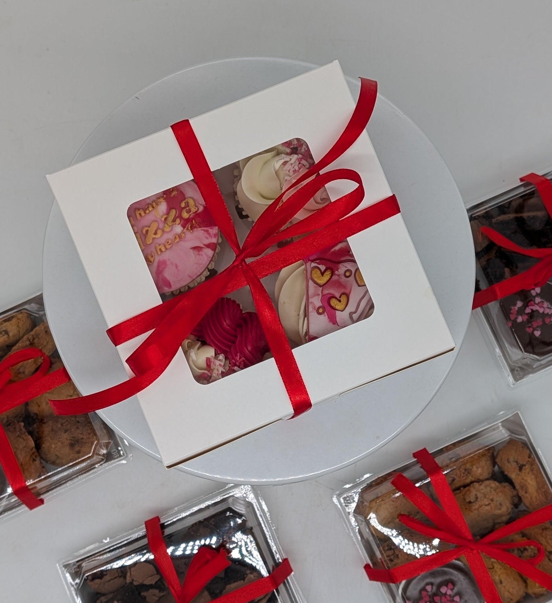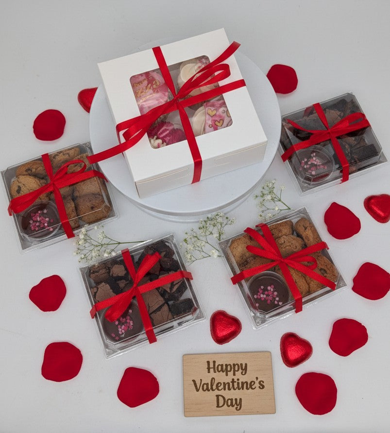A mini box of four cupcakes - perfect for sharing with your other half this Valentines day. Each box contains four cupcakes, two with themed toppers of your choice and two finished in piped decor. Finished in a hand tied red ribbon.